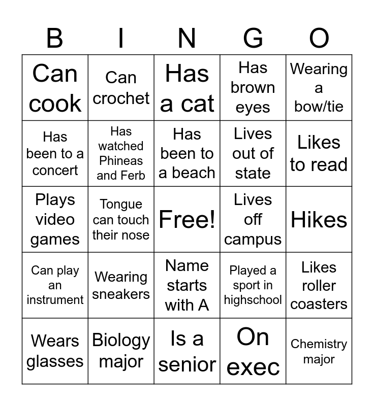 This bingo card has a free space and 45 words: Math major, Chemistry major, Has a dog, Wears glasses, Wearing blue, On exec, Has a cat, Lives on campus, Wearing a bow/tie, Biology major, Has brown eyes, Lives off campus, Name starts with A, Wearing sneakers, Wearing heels, Is a senior, Loves Taylor Swift, Plays video games, Has been out of the country, Likes to read, Can crochet, Is a sophomore, Biochem major, Can cook, Wearing pink, Hikes, Is from St. Louis, Is from Kansas City, Played a sport in highschool, Can play an instrument, Has watched Grey’s Anatomy, Likes roller coasters, Has brown hair, Favorite holiday is Halloween, Has a tattoo, Tongue can touch their nose, Can wiggle their ears, Favorite color is purple, Has watched the Minecraft Movie, Has been to a beach, Has been to a concert, Lives out of state, Can whistle, Has watched Phineas and Ferb and Likes Billie Eilish.