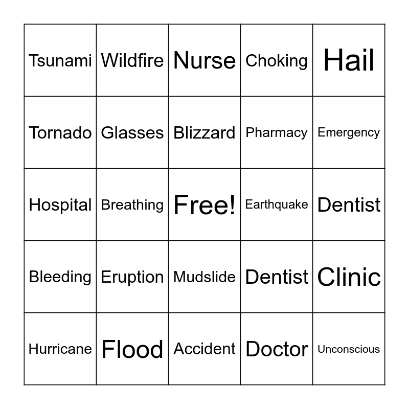 This bingo card has a free space and 24 words: Eruption, Flood, Blizzard, Hurricane, Hail, Tsunami, Tornado, Wildfire, Earthquake, Mudslide, Pharmacy, Hospital, Dentist, Clinic, Glasses, Doctor, Dentist, Nurse, Emergency, Breathing, Unconscious, Bleeding, Choking and Accident.