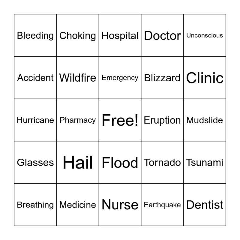 This bingo card has a free space and 24 words: Hail, Medicine, Emergency, Breathing, Unconscious, Bleeding, Accident, Choking, Eruption, Flood, Blizzard, Hurricane, Tornado, Tsunami, Wildfire, Earthquake, Mudslide, Hospital, Clinic, Pharmacy, Dentist, Glasses, Doctor and Nurse.