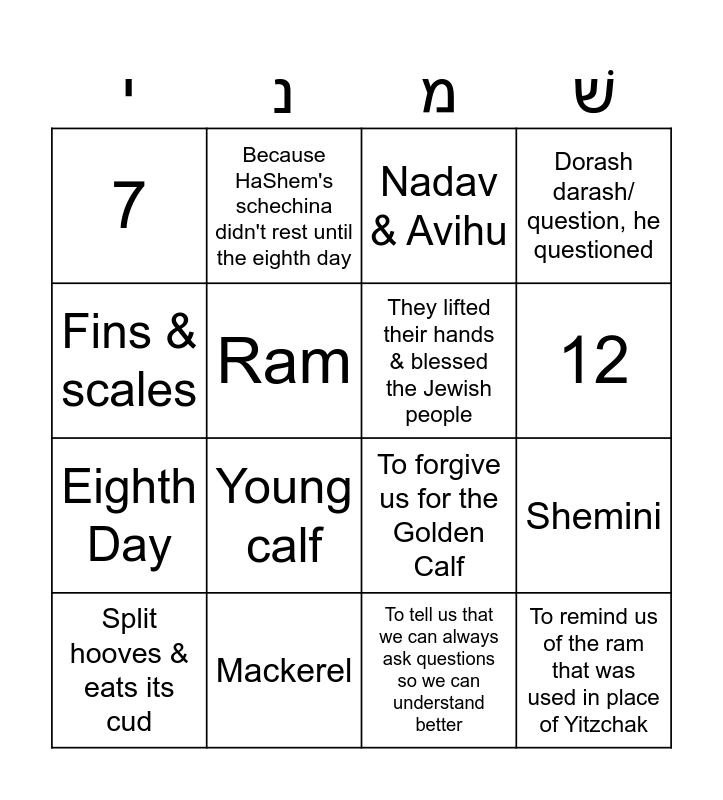 This bingo card has 20 words: Shemini, Fire came down from Heaven & rested on the mizbe'ach, Nadav & Avihu, Elazar & Issamar, Split hooves & eats its cud, Fins & scales, Mackerel, 7, Eighth Day, Because HaShem's schechina didn't rest until the eighth day, Young calf, To forgive us for the Golden Calf, Ram, To remind us of the ram that was used in place of Yitzchak, They lifted their hands & blessed the Jewish people, Vi'hi Noam, May the pleasantness of HaShem be upon us, 12, Dorash darash/ question, he questioned, To tell us that we can always ask questions so we can understand better and the Key ingredient.
