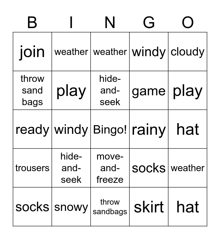 This bingo card has a free space and 45 words: clothes, hat, dress, socks, trousers, skirt, weather, sunny, cloudy, snowy, windy, rainy, move-and-freeze, hide-and-seek, skip rope, throw sandbags, game, ready, shirt, play, weather, hula hoop, cool, join, clothes, hat, shirt, dress, socks, trousers, skirt, weather, sunny, cloudy, snowy, windy, rainy, move-and-freeze, skip, hide-and-seek, throw sand bags, game, ready, play and hula hoop.