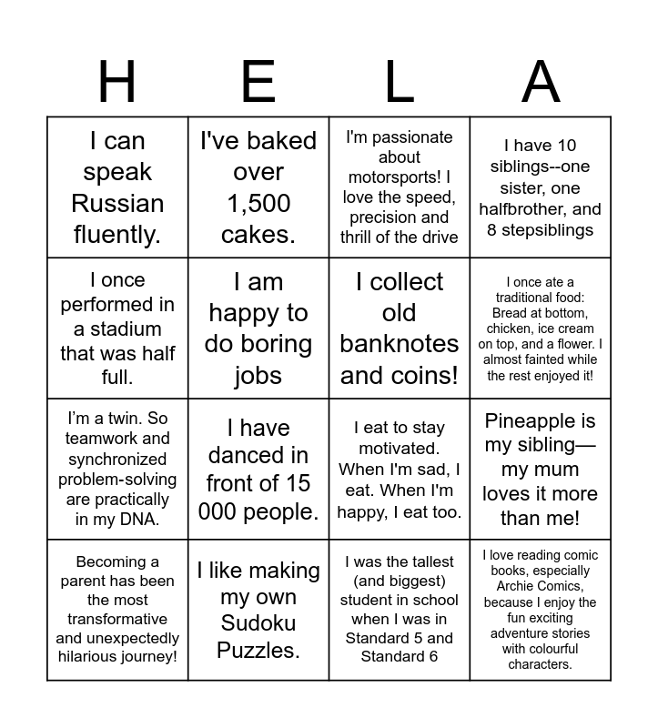 This bingo card has 24 words: Sometimes, to destress, I watch videos of baby animals up to their antics as I find them adorable., I have a scar on my philtrum until my septum, I once ate a traditional food: Bread at bottom, chicken, ice cream on top, and a flower. I almost fainted while the rest enjoyed it!, I have never lived in the city where I was born., I once performed in a stadium that was half full., I can speak Russian fluently., I am happy to do boring jobs, I've baked over 1,500 cakes., I like making my own Sudoku Puzzles., I read tarots and do energy healings 🦋, I’m a twin. So teamwork and synchronized problem‑solving are practically in my DNA., I eat to stay motivated. When I'm sad, I eat. When I'm happy, I eat too., I always scroll through food pictures before sleeping, I am a Michelia teacher who loves to read books, I collect old banknotes and coins!, New hobby - I bake cakes now. It keeps me calm. Thanks to home economics., I was the tallest (and biggest) student in school when I was in Standard 5 and Standard 6, I'm passionate about motorsports! I love the speed, precision and thrill of the drive, I have danced in front of 15 000 people., Pineapple is my sibling—my mum loves it more than me!, Becoming a parent has been the most transformative and unexpectedly hilarious journey!, I love reading comic books, especially Archie Comics, because I enjoy the fun exciting adventure stories with colourful characters., I have 10 siblings--one sister, one halfbrother, and 8 stepsiblings and I can dance, make animal sounds, and.....