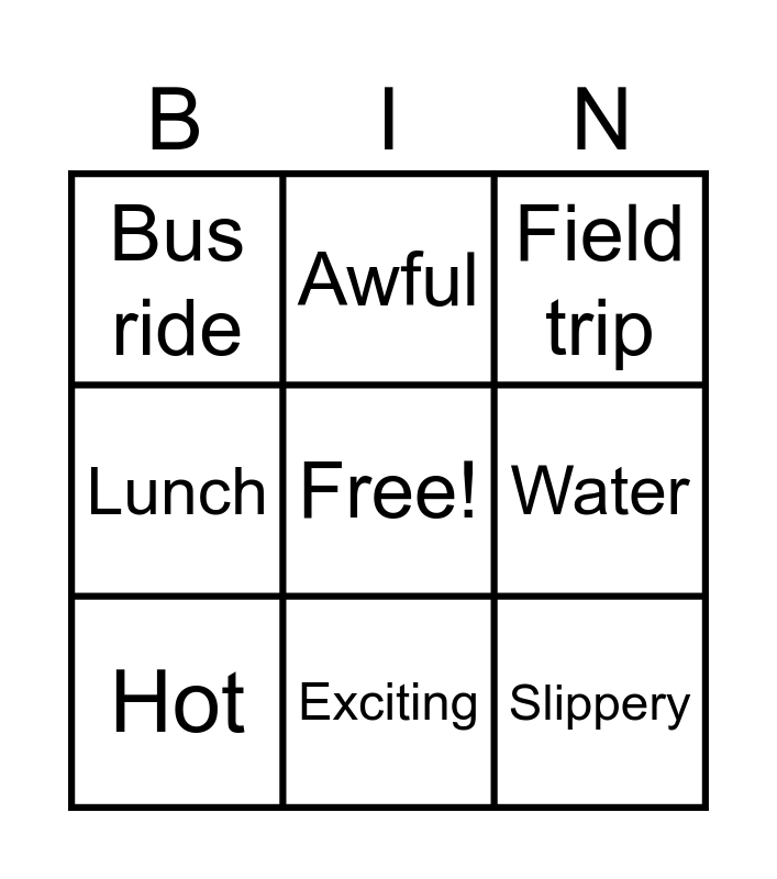 This bingo card has a free space and 15 words: Mammoth Cave, Tired, Field trip, Bus ride, Exciting, Slippery, Boat, Freezing, Cold, Hot, Dangerous, Water, Lunch, Awful and amazing.