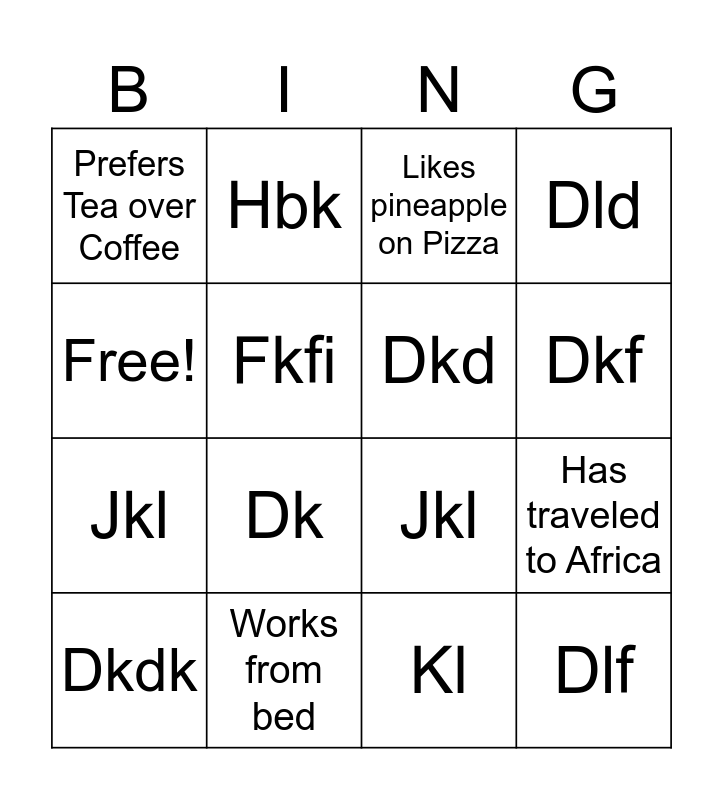 This bingo card has 16 words: Works from bed, Has traveled to Africa, Likes pineapple on Pizza, Prefers Tea over Coffee, Jkl, Hbk, Jkl, Kl, Free!, Fkfi, Dkdk, Dld, Dk, Dkf, Dkd and Dlf.