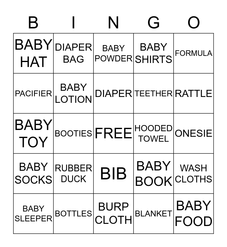 This bingo card has a free space and 24 words: RUBBER DUCK, BOTTLES, DIAPER, BABY SLEEPER, FORMULA, BABY HAT, PACIFIER, DIAPER BAG, HOODED TOWEL, BIB, TEETHER, BABY TOY, BABY BOOK, WASH CLOTHS, BABY LOTION, BLANKET, ONESIE, BABY POWDER, RATTLE, BOOTIES, BABY FOOD, BABY SOCKS, BABY SHIRTS and BURP CLOTH.