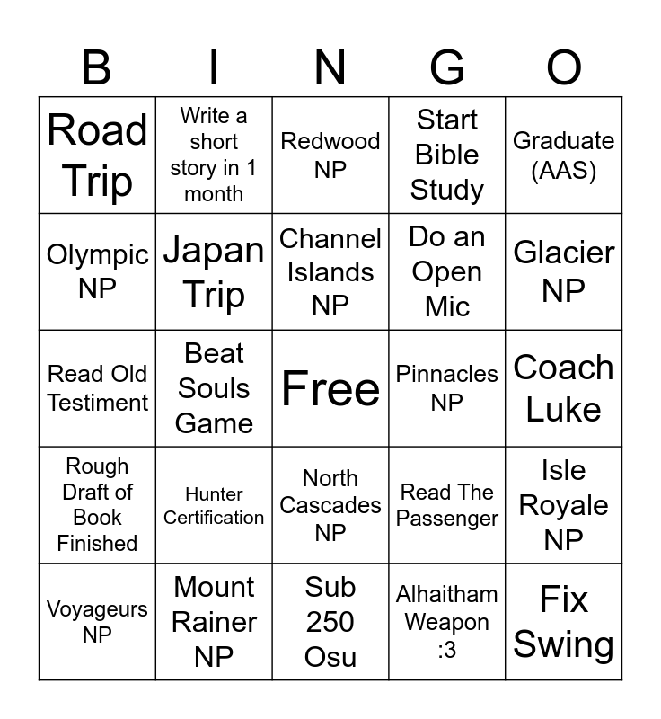 This bingo card has a free space and 24 words: Hunter Certification, Mount Rainer NP, Channel Islands NP, Voyageurs NP, Graduate (AAS), Road Trip, Olympic NP, Write a short story in 1 month, Pinnacles NP, North Cascades NP, Do an Open Mic, Read Old Testiment, Read The Passenger, Isle Royale NP, Japan Trip, Alhaitham Weapon :3, Coach Luke, Redwood NP, Glacier NP, Beat Souls Game, Fix Swing, Rough Draft of Book Finished, Start Bible Study and Sub 250 Osu.