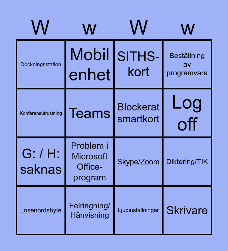 This bingo card has 29 words: Free!, Cosmic support/anvรคndarstรถd, Diktering/TIK, CAP/FAS, Dockningsstation, SITHS-kort, Blockerat smartkort, FO laboratorium รคrende, Felringning/ Hรคnvisning, Problem med installation (OS / program), Ljudinstรคllningar, Lรถsenordsbyte, MTDC รคrende, Cosmic Mediahanterare, Problem i Microsoft Office-program, Nรคtverk, Bildskรคrm, Skrivare, Konferensutrustning, Skype/Zoom, Statusfรถrfrรฅgan, VPN/domรคn, G: / H: saknas, Teams, Bestรคllning av programvara, Mobil enhet, Frenda, Log off and Visningslรคge i Office.