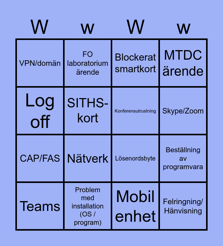This bingo card has 28 words: Cosmic support/anvรคndarstรถd, Diktering/TIK, CAP/FAS, Dockningsstation, SITHS-kort, Blockerat smartkort, FO laboratorium รคrende, Felringning/ Hรคnvisning, Problem med installation (OS / program), Ljudinstรคllningar, Lรถsenordsbyte, MTDC รคrende, Cosmic Mediahanterare, Problem i Microsoft Office-program, Nรคtverk, Bildskรคrm, Skrivare, Konferensutrustning, Skype/Zoom, Statusfรถrfrรฅgan, VPN/domรคn, G: / H: saknas, Teams, Bestรคllning av programvara, Mobil enhet, Frenda, Log off and Visningslรคge i Office.