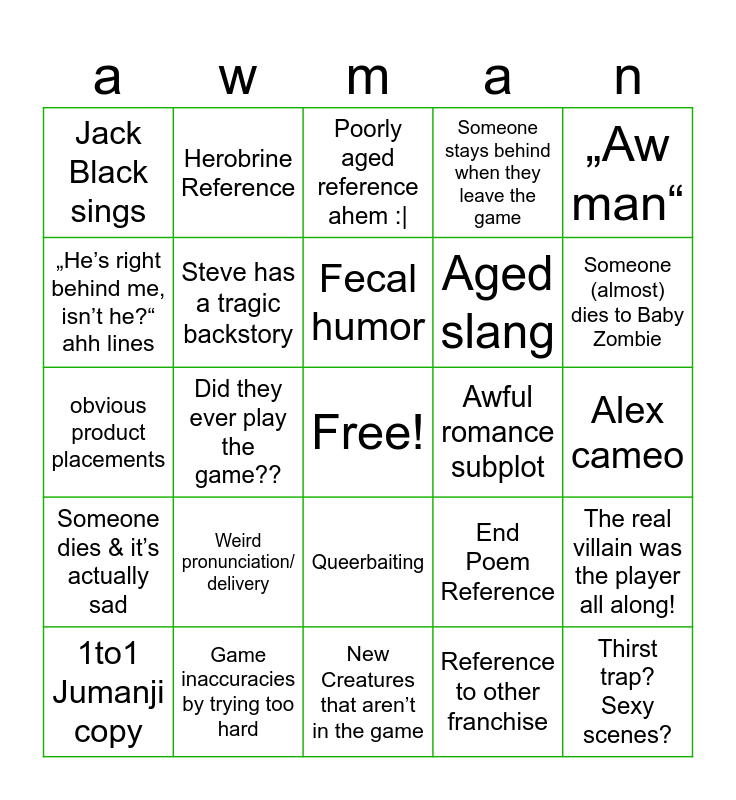 This bingo card has a free space and 24 words: Weird pronunciation/ delivery, Game inaccuracies by trying too hard, Fecal humor, 1to1 Jumanji copy, „Aw man“, Jack Black sings, „He’s right behind me, isn’t he?“ ahh lines, Herobrine Reference, Awful romance subplot, Queerbaiting, Aged slang, obvious product placements, End Poem Reference, The real villain was the player all along!, Steve has a tragic backstory, Reference to other franchise, Alex cameo, Poorly aged reference ahem :|, Someone (almost) dies to Baby Zombie, Did they ever play the game??, Thirst trap? Sexy scenes?, Someone dies & it’s actually sad, Someone stays behind when they leave the game and New Creatures that aren’t in the game.