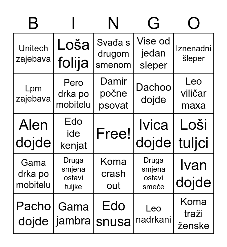 This bingo card has a free space and 26 words: Koma crash out, Leo nadrkani, Damir počne psovat, Gama jambra, Iznenadni šleper, Unitech zajebava, Lpm zajebava, Loša folija, Loši tuljci, Druga smjena ostavi smeće, Dachoo dojde, Alen dojde, Ivan dojde, Pacho dojde, Edo ide kenjat, Pero nekog dira, Vise od jedan sleper, Gama drka po mobitelu, Svađa s drugom smenom, Koma traži ženske, Leo viličar maxa, Edo snusa, Ivica dojde, Druga smjena ostavi tuljke, Pero drka po mobitelu and Karlo ne dojde.
