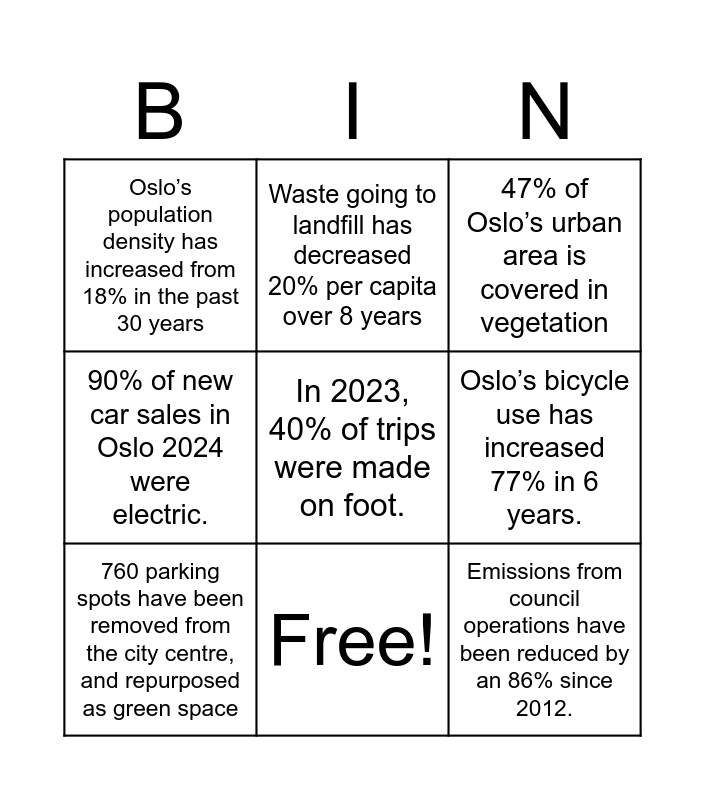 This bingo card has 10 words: Free!, 47% of Oslo’s urban area is covered in vegetation, Oslo’s population density has increased from 18% in the past 30 years, In 2023, 40% of trips were made on foot., 90% of new car sales in Oslo 2024 were electric., 760 parking spots have been removed from the city centre, and repurposed as green space, Waste going to landfill has decreased 20% per capita over 8 years, Oslo has 420 new small city farms / food gardens, Oslo’s bicycle use has increased 77% in 6 years. and Emissions from council operations have been reduced by an 86% since 2012..