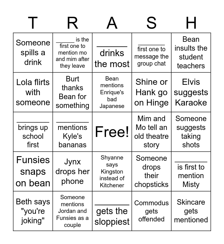 This bingo card has a free space and 24 words: Jynx drops her phone, Someone mentions Jordan and Funsies as a couple, Bean mentions Enrique's bad Japanese, Beth says "you're joking", Bean insults the student teachers, Someone spills a drink, Lola flirts with someone, ______ is the first one to mention mo and mim after they leave, Mim and Mo tell an old theatre story, Shyanne says Kingston instead of Kitchener, Shine or Hank go on Hinge, ________ brings up school first, Someone drops their chopsticks, ________ is first to mention Misty, Burt thanks Bean for something, Commodus gets offended, Someone suggests taking shots, ______ drinks the most, Elvis suggests Karaoke, ________ mentions Kyle's bananas, Skincare gets mentioned, Funsies snaps on bean, ________ first one to message the group chat and _______ gets the sloppiest.