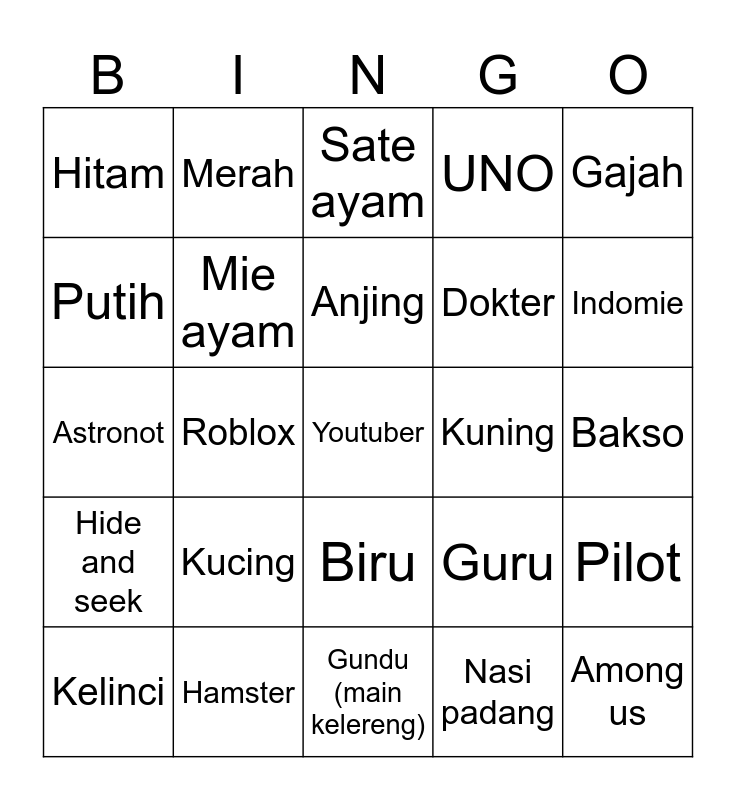 This bingo card has a free space and 24 words: Kucing, Hamster, Anjing, Kelinci, Gajah, Hitam, Putih, Merah, Kuning, Biru, Dokter, Astronot, Guru, Pilot, Mie ayam, Nasi padang, Bakso, Sate ayam, Indomie, Roblox, Among us, Hide and seek, UNO and Gundu (main kelereng).