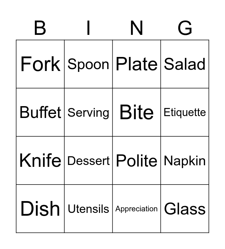 This bingo card has 16 words: Utensils, Napkin, Plate, Fork, Knife, Spoon, Polite, Appreciation, Buffet, Serving, Dish, Salad, Dessert, Etiquette, Bite and Glass.