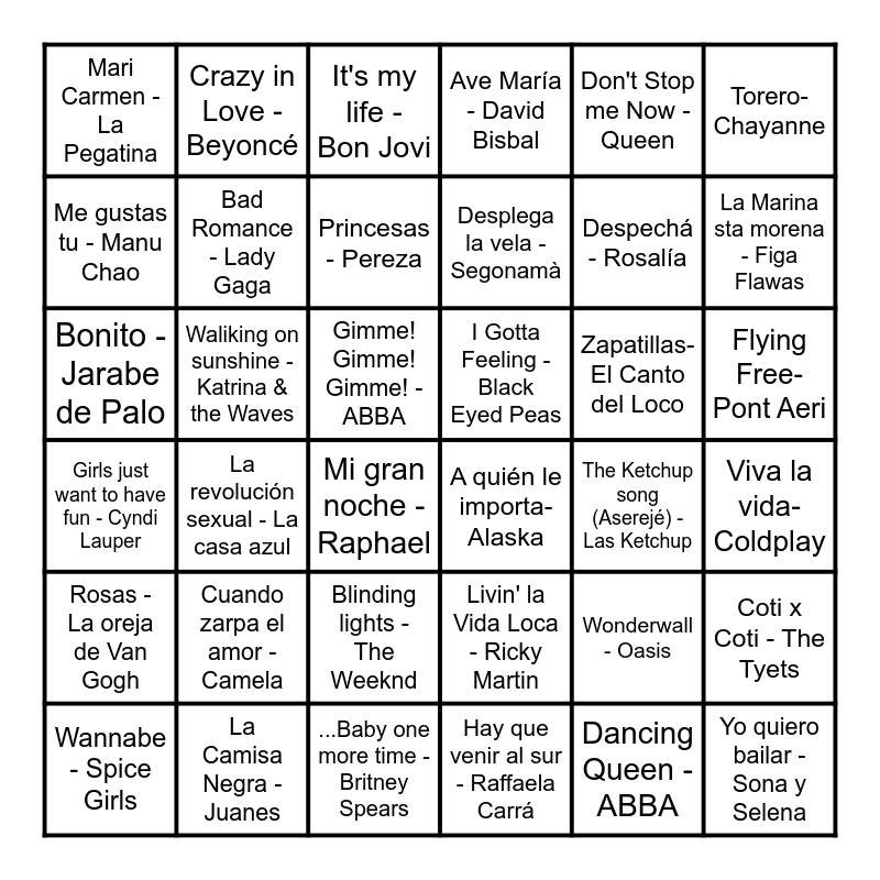 This bingo card has 54 words: Tú me dejaste de querer - C. Tangana, I Gotta Feeling - Black Eyed Peas, La flaca - Jarabe de Palo, Cuando zarpa el amor - Camela, Flying Free- Pont Aeri, Yo quiero bailar - Sona y Selena, Ave María - David Bisbal, Que la detengan - David Civera, Torero- Chayanne, Por la raja de tu falda - Estopa, Mari Carmen - La Pegatina, Hay que venir al sur - Raffaela Carrá, A quién le importa- Alaska, Mi gran noche - Raphael, La bomba- King Africa, The Ketchup song (Aserejé) - Las Ketchup, Bonito - Jarabe de Palo, Princesas - Pereza, Ay Mamá - Rigoberta Bandini, Gimme! Gimme! Gimme! - ABBA, Girls just want to have fun - Cyndi Lauper, Blinding lights - The Weeknd, Waliking on sunshine - Katrina & the Waves, Don't Stop me Now - Queen, It's Raining men - Geri Halliwell, Crazy in Love - Beyoncé, Wannabe - Spice Girls, Gasolina- Daddy Yankee, Livin' la Vida Loca - Ricky Martin, Viva la vida- Coldplay, Billie Jean - Michael Jackson, ...Baby one more time - Britney Spears, You're the one that I want - Grease, I want it that wat- Backstreet Boys, It's my life - Bon Jovi, Dancing Queen - ABBA, Despechá - Rosalía, La revolución sexual - La casa azul, Rosas - La oreja de Van Gogh, Me gustas tu - Manu Chao, Ella me levantó - Daddy Yankee, Tenia tanto que darte - Nena Daconte, Caminando por la vida- Melendi, Back to Black - Amy Winehouse, Zapatillas- El Canto del Loco, Umbrella - Rihanna, La Camisa Negra - Juanes, Wonderwall - Oasis, Bad Romance - Lady Gaga, La Marina sta morena - Figa Flawas, Desplega la vela - Segonamà, Una Llàgrima - Segonamà, Coti x Coti - The Tyets and In The Night - Oques Grasses.
