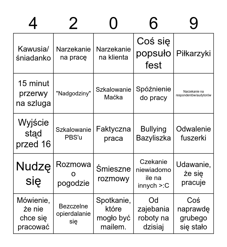 This bingo card has a free space and 24 words: Rozmowa o pogodzie, Bezczelne opierdalanie się, Szkalowanie Maćka, Mówienie, że nie chce się pracować, Piłkarzyki, Kawusia/śniadanko, 15 minut przerwy na szluga, Narzekanie na pracę, Bullying Bazyliszka, Śmieszne rozmowy, Spóźnienie do pracy, Wyjście stąd przed 16, Czekanie niewiadomo ile na innych >:C, Udawanie, że się pracuje, "Nadgodziny", Od zajebania roboty na dzisiaj, Odwalenie fuszerki, Narzekanie na klienta, Narzekanie na respondentów/audytorów, Szkalowanie PBS'u, Coś naprawdę grubego się stało, Nudzę się, Coś się popsuło fest and Spotkanie, które mogło być mailem..
