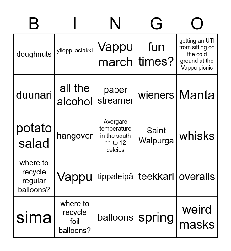 This bingo card has 25 words: Vappu, balloons, paper streamer, sima, getting an UTI from sitting on the cold ground at the Vappu picnic, doughnuts, duunari, ylioppilaslakki, Saint Walpurga, tippaleipä, wieners, potato salad, teekkari, overalls, all the alcohol, weird masks, whisks, Vappu march, Manta, hangover, Avergare temperature in the south 11 to 12 celcius, where to recycle foil balloons?, where to recycle regular balloons?, fun times? and spring.