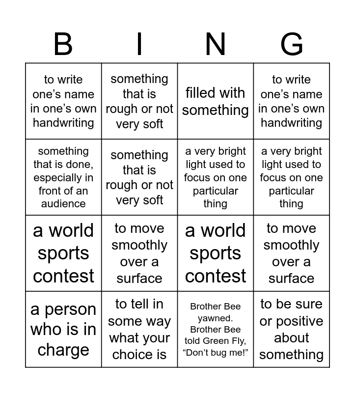 This bingo card has 16 words: to tell in some way what your choice is, to move smoothly over a surface, filled with something, to write one’s name in one’s own handwriting, a world sports contest, something that is rough or not very soft, a world sports contest, Brother Bee yawned. Brother Bee told Green Fly, “Don’t bug me!”, something that is done, especially in front of an audience, something that is rough or not very soft, a person who is in charge, to write one’s name in one’s own handwriting, to move smoothly over a surface, a very bright light used to focus on one particular thing, a very bright light used to focus on one particular thing and to be sure or positive about something.