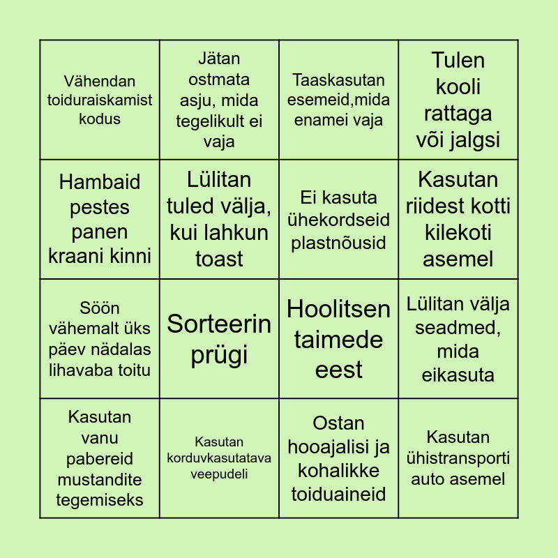 This bingo card has 16 words: Kasutan korduvkasutatava veepudeli, Lülitan välja seadmed, mida eikasuta, Taaskasutan esemeid,mida enamei vaja, Vähendan toiduraiskamist kodus, Söön vähemalt üks päev nädalas lihavaba toitu, Jätan ostmata asju, mida tegelikult ei vaja, Hoolitsen taimede eest, Ostan hooajalisi ja kohalikke toiduaineid, Hambaid pestes panen kraani kinni, Lülitan tuled välja, kui lahkun toast, Kasutan vanu pabereid mustandite tegemiseks, Tulen kooli rattaga või jalgsi, Sorteerin prügi, Kasutan riidest kotti kilekoti asemel, Ei kasuta ühekordseid plastnõusid and Kasutan ühistransporti auto asemel.