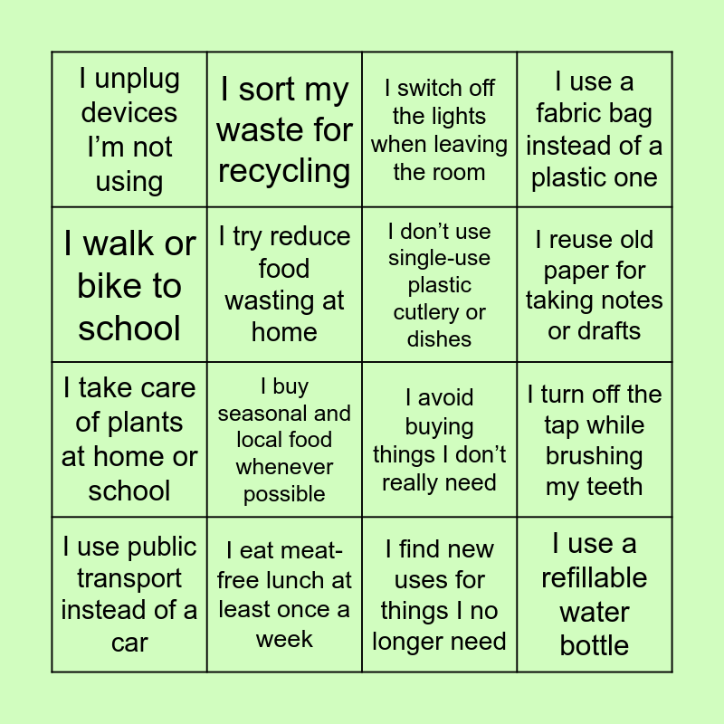 This bingo card has 16 words: I eat meat-free lunch at least once a week, I turn off the tap while brushing my teeth, I switch off the lights when leaving the room, I unplug devices I’m not using, I take care of plants at home or school, I sort my waste for recycling, I avoid buying things I don’t really need, I find new uses for things I no longer need, I walk or bike to school, I try reduce food wasting at home, I use public transport instead of a car, I use a fabric bag instead of a plastic one, I buy seasonal and local food whenever possible, I reuse old paper for taking notes or drafts, I don’t use single-use plastic cutlery or dishes and I use a refillable water bottle.