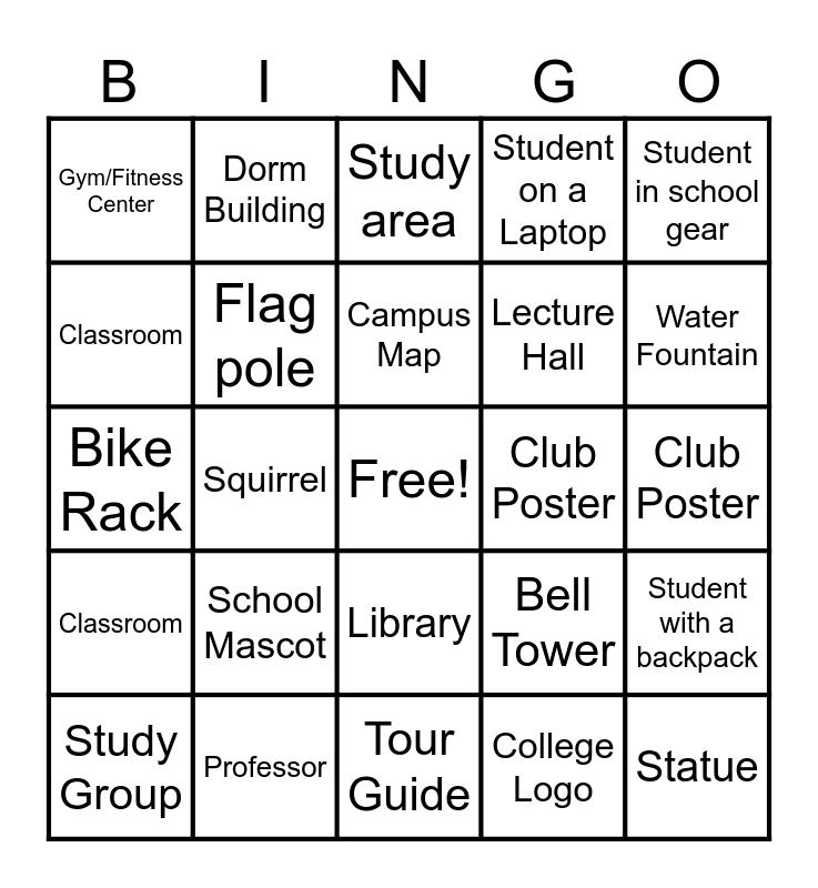 This bingo card has a free space and 42 words: Dining Hall, Campus Map, Dorm Building, School Mascot, College Logo, Student with a backpack, Statue, Sports field, Study area, Library, Club Poster, Water Fountain, Squirrel, Student in school gear, Science Building, Bell Tower, Charging Station, Bike Rack, Library, Dorm Building, Classroom, Science Lab, Student Center, Gym/Fitness Center, Auditorium, Bookstore, Lecture Hall, Bookstore, Fitness center, Tour guide, Professor, Classroom, Flag pole, Tour Guide, Student in College Gear, Study Group, Professor, Club Poster, Someone Playing Music, Group of Friends, Student on a Laptop and Student Wearing Headphones.