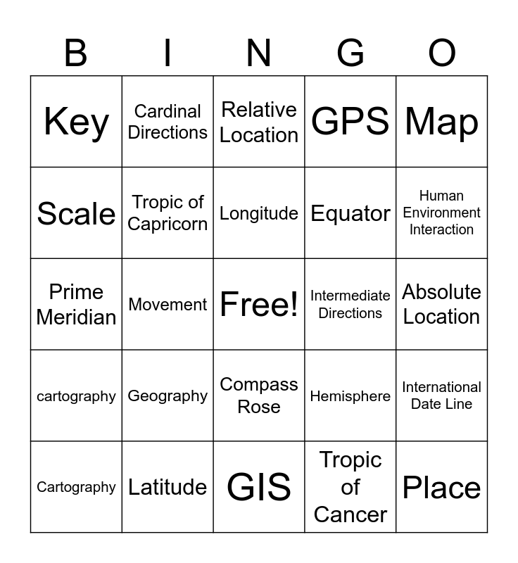 This bingo card has a free space and 24 words: Geography, Latitude, Longitude, Cartography, Map, Key, Scale, Cardinal Directions, Intermediate Directions, Compass Rose, Equator, Prime Meridian, Hemisphere, International Date Line, Tropic of Capricorn, Tropic of Cancer, Absolute Location, Relative Location, Human Environment Interaction, Movement, Place, cartography, GPS and GIS.