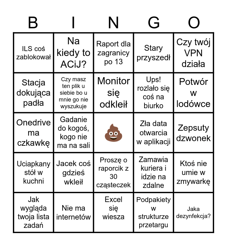 This bingo card has a free space and 44 words: Czy ktoś dodał oferentów?, Jaka dezynfekcja?, Komtur jest nie wprowadzony, Jak wygląda twoja lista zadań, Szybki raporcik z dziwnych danych, Podpakiety w strukturze przetargu, Raport dla zagranicy po 13, Wypięło foldery z onedrive, Czy twój VPN działa, Nie ma internetów, Stary przyszedł, Zła data otwarcia w aplikacji, Proszę o raporcik z 30 cząsteczek, Jacek coś gdzieś wkleił, Pozycje które powinny być pakietami, Excel się wiesza, Czy działa wam AK?, Onedrive ma czkawkę, Dane z AK nie zgadzają się z Access'em, Potwór w lodówce, Na kiedy to ACiJ?, Aktualizacja windows'a niszcząca wszystko, Roboty się posypały, ILS coś zablokował, Syf w łazience, Zepsuty dzwonek, Potykam się o kartony, A co z tą dezynfekcją?, Zamawia kuriera i idzie na zdalne, Uciapkany stół w kuchni, Wpuście mnie nie mam karty, Ktoś nie umie w zmywarkę, Nie mam gdzie zaparkować, Siekiera w powietrzu, Gadanie do kogoś, kogo nie ma na sali, Hurtownia jest opóźniona, Patrycja nie słucha a odpowiada na pytania, Wiadomości lepiej docierają do adresata po ich wysłaniu, Monitor się odkleił, Stacja dokująca padła, Ups! rozlało się coś na biurko, Co ten kubeł robi pod nogami?!, Czy masz ten plik u siebie bo u mnie go nie wyszukuje and Lista zadań uległa "awarii".