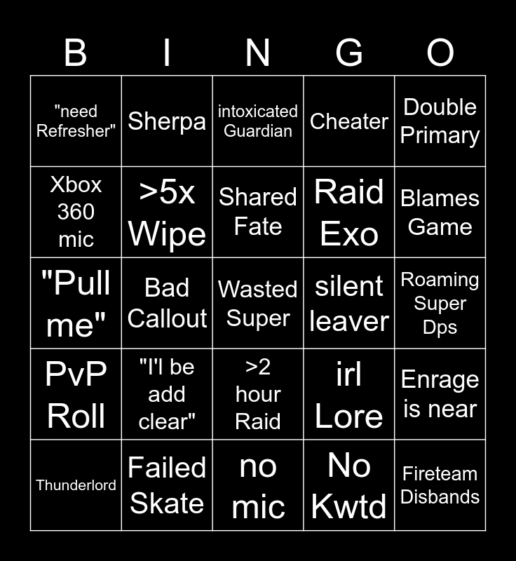 This bingo card has 25 words: "I'l be add clear", no mic, Shared Fate, Thunderlord, Double Primary, "need Refresher", Xbox 360 mic, Sherpa, silent leaver, >2 hour Raid, Raid Exo, "Pull me", irl Lore, Enrage is near, >5x Wipe, Fireteam Disbands, Roaming Super Dps, intoxicated Guardian, Blames Game, Bad Callout, Wasted Super, Failed Skate, PvP Roll, Cheater and No Kwtd.