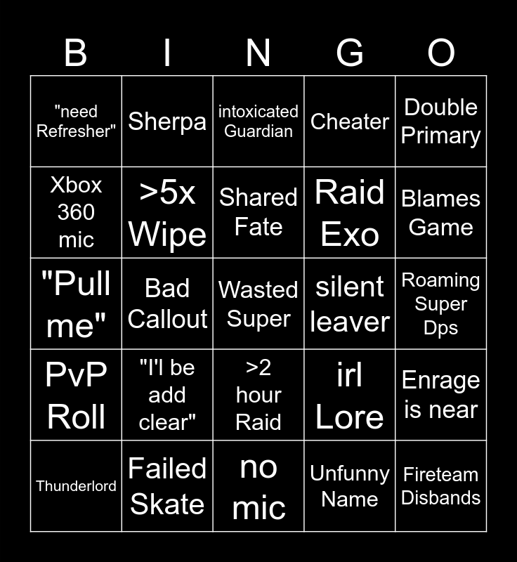 This bingo card has 25 words: "I'l be add clear", no mic, Shared Fate, Thunderlord, Double Primary, "need Refresher", Xbox 360 mic, Sherpa, silent leaver, >2 hour Raid, Raid Exo, "Pull me", irl Lore, Enrage is near, >5x Wipe, Fireteam Disbands, Roaming Super Dps, intoxicated Guardian, Blames Game, Bad Callout, Wasted Super, Failed Skate, PvP Roll, Cheater and Unfunny Name.