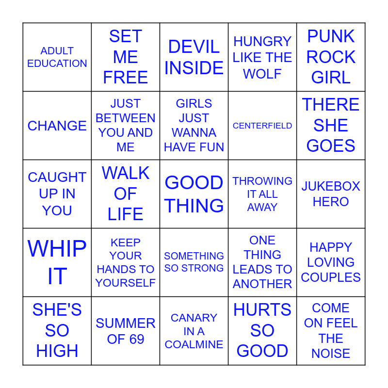 This bingo card has 40 words: REMEMBER THE LIGHTNING, CAUGHT UP IN YOU, SOMEBODY LIKE YOU, JUST BETWEEN YOU AND ME, SUMMER OF 69, SOMETHING SO STRONG, GIRLS JUST WANNA HAVE FUN, CHINA GIRL, PUNK ROCK GIRL, WHIP IT, WALK OF LIFE, HUNGRY LIKE THE WOLF, GOOD THING, JUKEBOX HERO, THROWING IT ALL AWAY, KEEP YOUR HANDS TO YOURSELF, I WILL SURVIVE, ADULT EDUCATION, TIME OF THE SEASON, DEVIL INSIDE, HAPPY LOVING COUPLES, HURTS SO GOOD, CENTERFIELD, CHANGE, WALKING ON SUNSHINE, POP MUZIK, SAY SAY SAY, BEDS ARE BURNING, COME ON FEEL THE NOISE, TAKE IT ON THE RUN, HEY NINETEEN, SHE'S SO HIGH, MOVING IN STEREO, ONE THING LEADS TO ANOTHER, THERE SHE GOES, CANARY IN A COALMINE, CERTAIN KINDA GIRL, SHE'S A BEAUTY, SET ME FREE and FREEDOM.