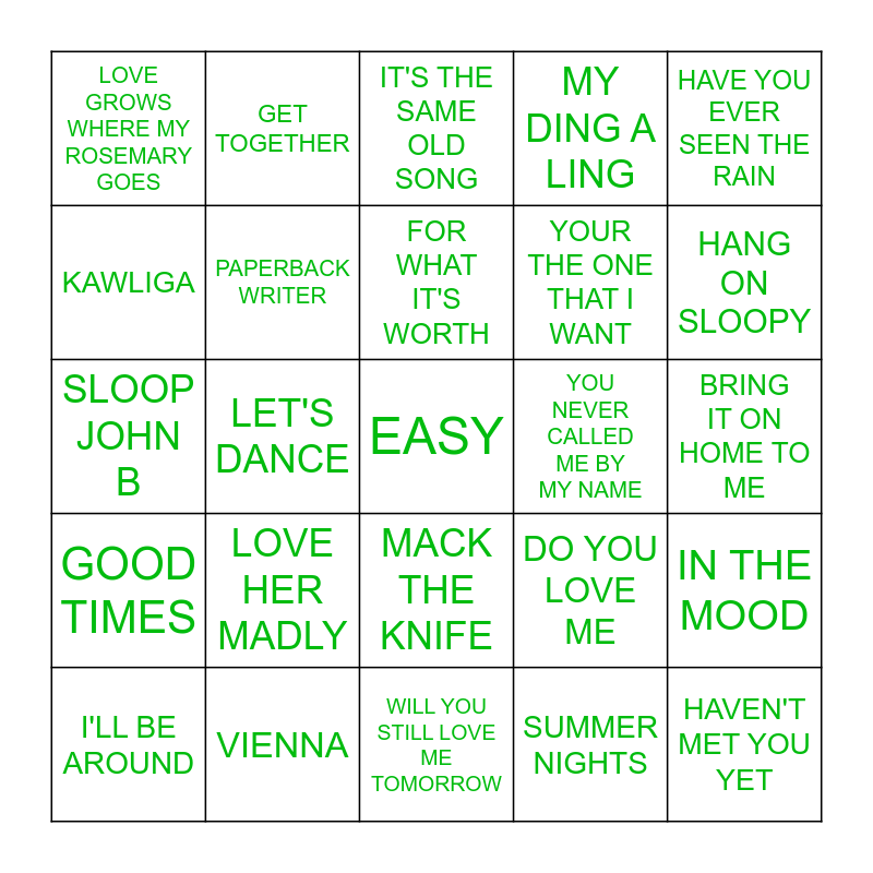 This bingo card has 40 words: MONEY, SLOOP JOHN B, I FEEL FINE, PAPERBACK WRITER, VIENNA, MACK THE KNIFE, FOR WHAT IT'S WORTH, BAD MOON RISING, HAVE YOU EVER SEEN THE RAIN, GOOD TIMES, LET'S DANCE, MY DING A LING, EASY, BRING IT ON HOME TO ME, YOU NEVER CALLED ME BY MY NAME, LOVE HER MADLY, BOOGIE WONDERLAND, LOVE GROWS WHERE MY ROSEMARY GOES, SHERRY, IT'S THE SAME OLD SONG, IN THE MOOD, SUMMER NIGHTS, YOUR THE ONE THAT I WANT, KAWLIGA, HEIDI'S BIER HAUS, I GOT YOU, LIVING IN AMERICA, OPERATOR, HAVEN'T MET YOU YET, THIS OLD HEART OF MINE, TEARS OF A CLOWN, I'LL BE AROUND, AIN'T TOO PROUD TO BEG, DO YOU LOVE ME, HANG ON SLOOPY, WILL YOU STILL LOVE ME TOMORROW, BABY LOVE, YOU CAN'T HURRY LOVE, GET TOGETHER and THE LADY IS A TRAMP.