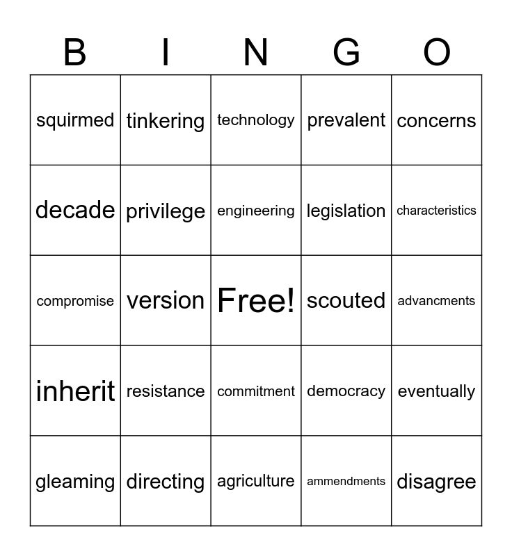 This bingo card has a free space and 24 words: resistance, directing, engineering, gleaming, concerns, squirmed, decade, tinkering, scouted, commitment, legislation, compromise, democracy, eventually, privilege, ammendments, advancments, technology, characteristics, version, disagree, inherit, prevalent and agriculture.