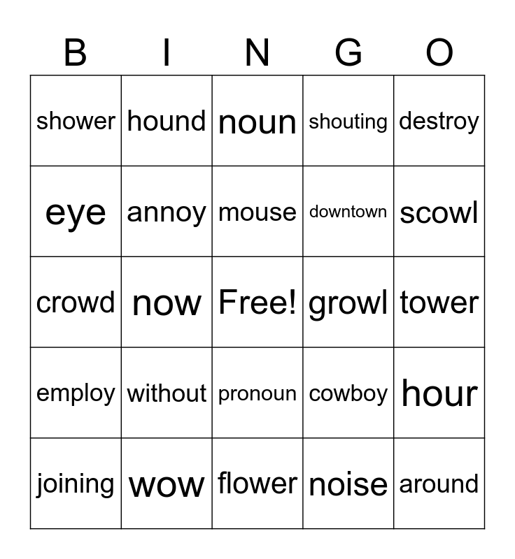This bingo card has a free space and 34 words: oyster, noise, moist, point, employ, annoy, destroy, joining, hound, ground, mouse, noun, ouch, plow, growl, scowl, wow, crowd, without, cowboy, pronoun, powder, shower, tower, flower, around, shouting, boy, downtown, eye, how, now, hour and minute.