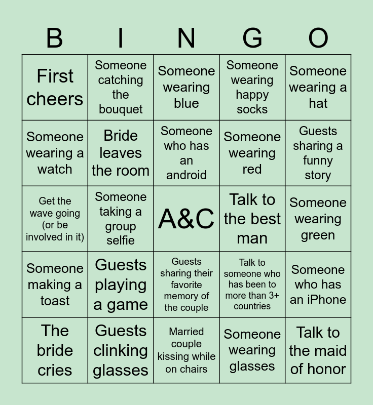This bingo card has a free space and 55 words: BINGO A&C, The bride cries, The brides dad cries, First cheers, Married couple kissing while on chairs, Married couple kissing under table, Bride leaves the room, Groom leaves the room, Someone wearing red, Someone loses their cutlery on the floor, Someone wearing happy socks, Talk to someone who has been married for 5+ years, Talk to someone who has a tattoo, Talk to someone who has a dog, Talk to someone who has a cat, Someone changing their outfit, Someone wearing a hat, Someone taking a group selfie, Talk to a bridesmaid, Talk to the maid of honor, Talk to the best man, Someone the same age as you, Talk to someone who has been to more than 3+ countries, Someone wearing blue, Talk to someone from out of town, Someone who has an android, Someone wearing glasses, Someone wearing white, Someone wearing green, Someone who has an iPhone, Get a conga going (or be involved in it), Talk to someone who has two children, Someone wearing golden chain, Someone wearing rings, Someone wearing a watch, Get the wave going (or be involved in it), Bride and groom dancing, Someone making a toast, Guests signing a guestbook, Bride and groom cutting the cake, Someone catching the bouquet, Bride and groom feeding each other cake, Someone wearing a bow tie, Someone wearing floral prints, Guests playing a game, Guests clinking glasses, Someone with a musical instrument, Someone with a funny dance move, Guests forming a dance circle, Guests sharing a funny story, Guests sharing travel stories, Guests exchanging contact information, Guests making a funny face, Guests sharing their favorite memory of the couple and Your favorite party song plays.