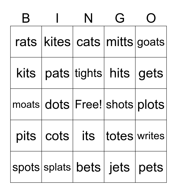 This bingo card has a free space and 29 words: spots, pots, dots, mats, rats, cats, pats, cots, shots, splats, plots, pets, bets, jets, gets, lets, its, pits, goats, moats, totes, sets, hits, kits, mitts, kites, writes, tights and nights.