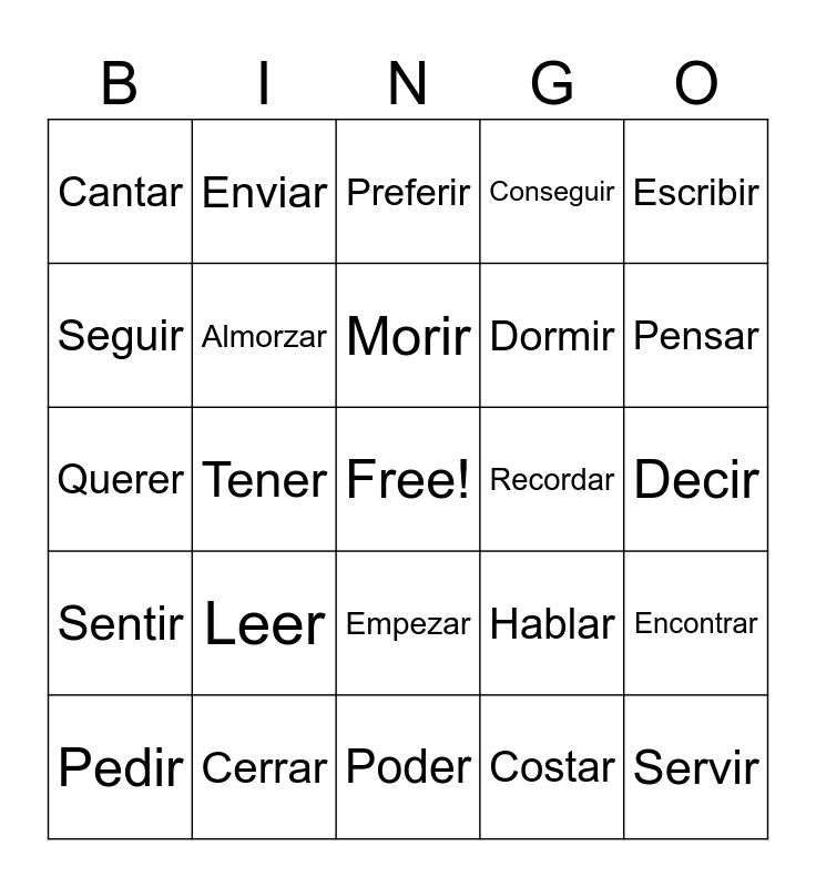 This bingo card has a free space and 24 words: Leer, Cerrar, Morir, Pedir, Escribir, Cantar, Seguir, Enviar, Recordar, Empezar, Dormir, Querer, Hablar, Encontrar, Almorzar, Costar, Decir, Preferir, Pensar, Tener, Servir, Sentir, Conseguir and Poder.