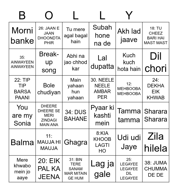 This bingo card has 100 words: Free!, It’s the time to disco, Main yahaan hun yahaan, Dil dooba, Maahi ve, Jab se tere naina, Piyu bole, Dupatta tera nau rang da, Kehdoon tumhe, Woh ladki hain kahaan, Ek ajnabee haseena se, Main agar kahoon, Coca Cola, Pyaar ki kashti mein, Nagada nagada, Lag ja gale, Abhi na jao chhod kar, Kajra re, Tujhe kitna chahne lage hum, Beedi jalaiyle, Husn hain suhana, Ankhiyon se goli maare, Chunari chunari, O girl, you’re mine, Afghan jalebi, Bole chudiyan, Akh lad jaave, You are my Sonia, Ladki kyun na jaane kyun, Gallan goodiyan, Dil chori, Morni banke, Tumse mil ke dil ka hai joh haal, Kamariya hila de, Sharara Sharara, Break-up song, DHEERE DHEERE SE MERI ZINDAGI MAIN ANA, Le gayi, Mere khwabo mein jo aaye, Balma, Suraj hua madhham, Chaiyaan Chaiyaan, Kuch kuch hota hain, Ghagra, Lal dupatta, Tu mere agal bagal hain, Sweety tera drama, Jogi maahi, Pehla pehla pyaar hain, Tamma tamma, Dekho maine dekha hain, Udi udi Jaye, Zila hilela, Raat baaki, Kuch toh hua hain, Haila haila hua hua, Navrai majhi, Aaj unse milna hain hume, Chalao na naina se, Subah hone na de, Maiyyan Yashoda, 2: MERA DIL BHI KITNA PAGAL HAI, 3: TU TU HAI WOHI, 4: KIA YEHI PYAR HAI, 5: CHEHRA HAI YA CHAND KHILA HAI, 6: DEKHTE DEKHTE, 7: RASHKE QAMAR, 8:KIA KHOOB LAGTI HO, 9: GULABI AANKHAIN, 10: YEH ISHQ HAI, 11: MAUJA HI MAUJA, 12: MEHBOOBA MEHBOOBA, 13: PAPA KEHTE HAIN, 14: HEY SHONA, 15: CHAND MERA DIL, 16: DEKH KE TUJH KO DIL DOLA HAI, 17: AA AASHQUI MAIN TERI, 18: TU CHEEZ BARI HAI MAST MAST, 19: DEKHA HAI PEHLI BAR, 20: EIK PAL KA JEENA, 21: AYE MERE HUMSAFAR, 22: TIP TIP BARSA PAANI, 23: MAIN TENU SAMJHAWAN KI, 24: DEKHA EIK KHWAB, 25: LEGAYEE LEGAYEE DIL LEGAYEE, 26: JAAN E JAAN DHOONDTA PHIR, 27: JAWANI JAANEMAN, 28: LAILA MAIN LAILA, 29: MAIN SHAYAR TU NAHIN, 30. NEELE NEELE AMBAR PER, 31: BIN TERE SANAM MAR MITAIN GE HUM, 32: APNI TU JAISAY TESAY, 33: BACHNA AIY HASEENO, 34: DUS BAHANE, 35: AINWAYEEN AINWAYEEN, 36: CHUNARI CHUNARI, 37: O O JAANE JANA, 38: JUMA CHUMMA DE DE, 39: AAJ KAL TERE MERE PYAR KE CHURCHAY and 40: CHURA LIYA HAI TUM NE JO DIL KO.