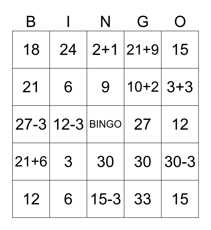This bingo card has a free space and 24 words: 3, 6, 9, 12, 15, 18, 21, 24, 27, 30, 10+2, 27-3, 30, 30-3, 6, 33, 12, 2+1, 3+3, 12-3, 15, 21+6, 21+9 and 15-3.
