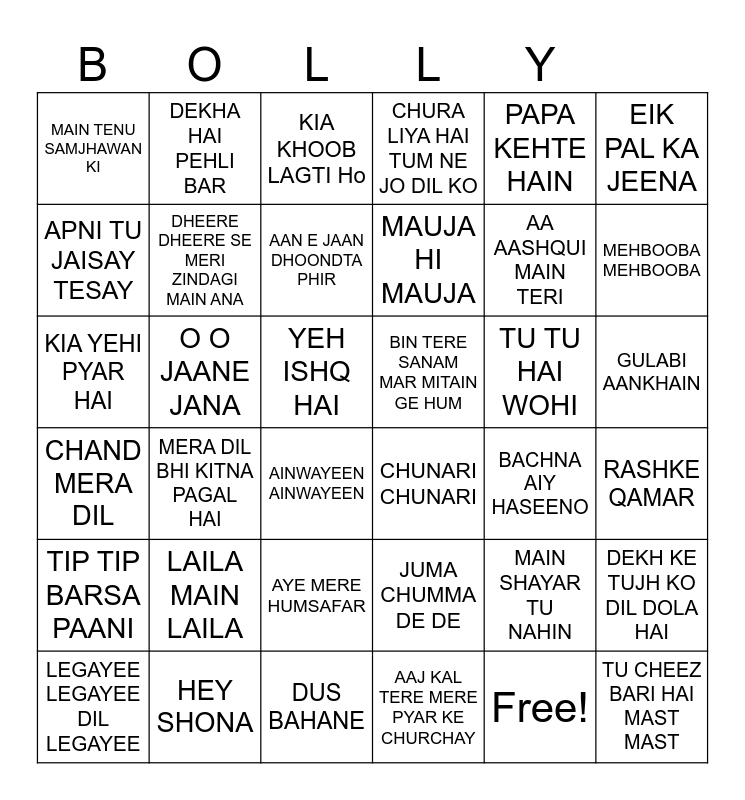 This bingo card has 42 words: Free!, DHEERE DHEERE SE MERI ZINDAGI MAIN ANA, CHEHRA HAI YA CHAND KHILA HAI, TU TU HAI WOHI, RASHKE QAMAR, MERA DIL BHI KITNA PAGAL HAI, KIA YEHI PYAR HAI, DEKHTE DEKHTE, KIA KHOOB LAGTI Ho, GULABI AANKHAIN, YEH ISHQ HAI, MAUJA HI MAUJA, MEHBOOBA MEHBOOBA, PAPA KEHTE HAIN, HEY SHONA, CHAND MERA DIL, DEKH KE TUJH KO DIL DOLA HAI, AA AASHQUI MAIN TERI, TU CHEEZ BARI HAI MAST MAST, DEKHA HAI PEHLI BAR, EIK PAL KA JEENA, AYE MERE HUMSAFAR, TIP TIP BARSA PAANI, MAIN TENU SAMJHAWAN KI, DEKHA EIK KHWAB, LEGAYEE LEGAYEE DIL LEGAYEE, AAN E JAAN DHOONDTA PHIR, JAWANI JAANEMAN, LAILA MAIN LAILA, MAIN SHAYAR TU NAHIN, NEELE NEELE AMBAR PER, BIN TERE SANAM MAR MITAIN GE HUM, APNI TU JAISAY TESAY, BACHNA AIY HASEENO, DUS BAHANE, AINWAYEEN AINWAYEEN, CHUNARI CHUNARI, O O JAANE JANA, JUMA CHUMMA DE DE, AAJ KAL TERE MERE PYAR KE CHURCHAY, CHURA LIYA HAI TUM NE JO DIL KO and FREE.