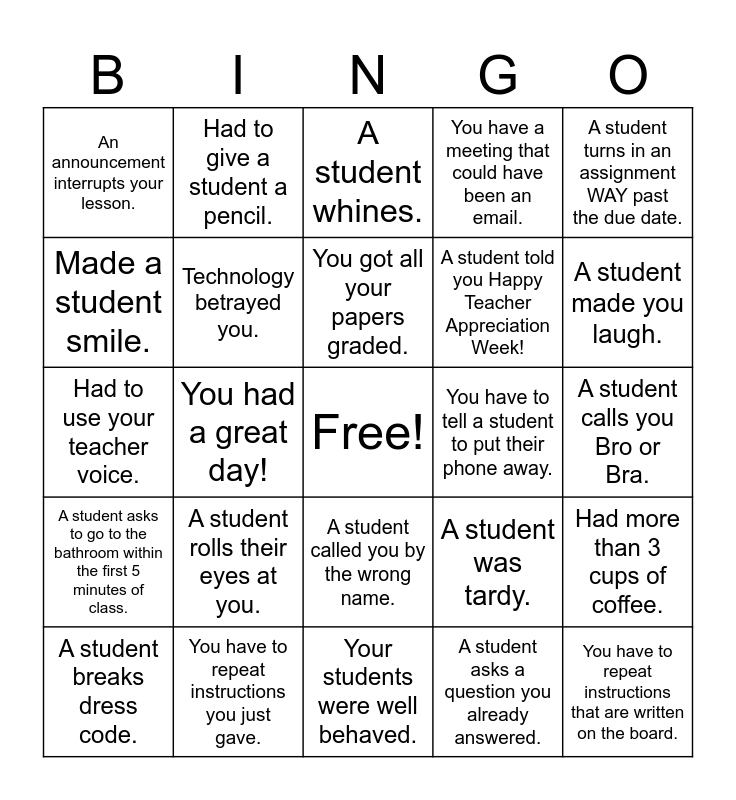 This bingo card has a free space and 24 words: A student rolls their eyes at you., You have to repeat instructions you just gave., You got all your papers graded., A student breaks dress code., A student turns in an assignment WAY past the due date., An announcement interrupts your lesson., Made a student smile., Had to give a student a pencil., You have to tell a student to put their phone away., A student called you by the wrong name., A student told you Happy Teacher Appreciation Week!, Had to use your teacher voice., A student was tardy., Had more than 3 cups of coffee., Technology betrayed you., A student asks a question you already answered., A student calls you Bro or Bra., A student whines., A student made you laugh., You had a great day!, You have to repeat instructions that are written on the board., A student asks to go to the bathroom within the first 5 minutes of class., You have a meeting that could have been an email. and Your students were well behaved..
