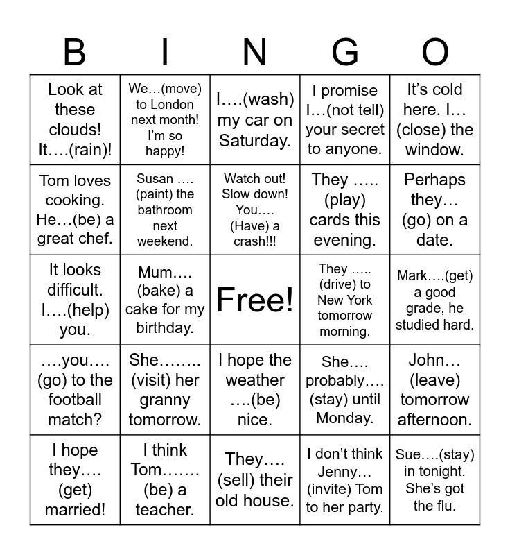 This bingo card has a free space and 24 words: She……..(visit) her granny tomorrow., I think Tom…….(be) a teacher., Watch out! Slow down! You….(Have) a crash!!!, I hope they….(get) married!, It’s cold here. I…(close) the window., Look at these clouds! It….(rain)!, Tom loves cooking. He…(be) a great chef., We…(move) to London next month! I’m so happy!, They …..(drive) to New York tomorrow morning., I hope the weather ….(be) nice., They …..(play) cards this evening., It looks difficult. I….(help) you., She…. probably….(stay) until Monday., John…(leave) tomorrow afternoon., Susan ….(paint) the bathroom next weekend., I don’t think Jenny…(invite) Tom to her party., Mark….(get) a good grade, he studied hard., I….(wash) my car on Saturday., Perhaps they…(go) on a date., Mum….(bake) a cake for my birthday., Sue….(stay) in tonight. She’s got the flu., ….you….(go) to the football match?, I promise I…(not tell) your secret to anyone. and They….(sell) their old house..
