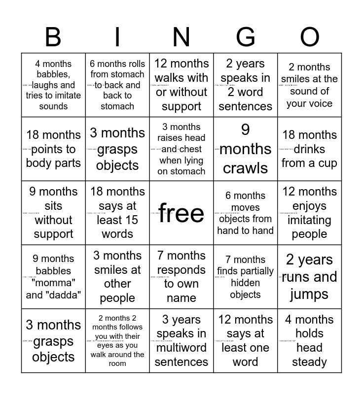 This bingo card has 23 images, a free space and 24 words: 3 months smiles at other people, 2 months 2 months follows you with their eyes as you walk around the room, 3 months raises head and chest when lying on stomach, 3 months grasps objects, 2 months smiles at the sound of your voice, 4 months babbles, laughs and tries to imitate sounds, 18 months points to body parts, 6 months rolls from stomach to back and back to stomach, 6 months moves objects from hand to hand, 7 months responds to own name, 9 months crawls, 9 months sits without support, 7 months finds partially hidden objects, 2 years runs and jumps, 3 months grasps objects, 12 months says at least one word, 12 months enjoys imitating people, 12 months walks with or without support, 18 months drinks from a cup, 18 months says at least 15 words, 4 months holds head steady, 9 months babbles "momma" and "dadda", 2 years speaks in 2 word sentences and 3 years speaks in multiword sentences.