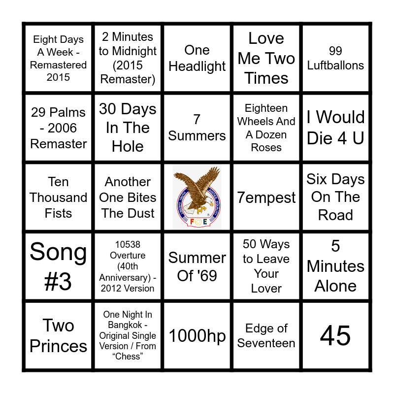 This bingo card has a free space and 52 words: 100%, 45, 99, 1000hp, 10538 Overture (40th Anniversary) - 2012 Version, 18 and Life (2016 Remaster), 2 Minutes to Midnight (2015 Remaster), 25 or 6 to 4 - 2002 Remaster, 29 Palms - 2006 Remaster, 3 Libras, 30 Days In The Hole, 3AM, 5 Minutes Alone, 50 Ways to Leave Your Lover, 50 Ways to Say Goodbye, 6th Avenue Heartache, 7 Summers, 7empest, 867-5309 / Jenny, 99 Luftballons, Another One Bites The Dust, Edge of Seventeen, Eight Days A Week - Remastered 2015, Eighteen Wheels And A Dozen Roses, Five Minutes, Hangar 18 - 2004 Remix, Happy Birthday, Sweet Sixteen, I Can't Drive 55, I Would Die 4 U, I'm Eighteen, I'm Gonna Be (500 Miles), Love Me Two Times, My Next Thirty Years, One, One (Remastered), One Headlight, One Night In Bangkok - Original Single Version / From “Chess”, One Week, Seven Bridges Road - Live; 1999 Remaster, Seven Nation Army, Seven Wonders - 2017 Remaster, Six Days On The Road, Song #3, Song 2, Summer Of '69, Sweet Little Sixteen, Ten Thousand Angels, Ten Thousand Fists, The I-95 Asshole Song, Thirty-Three - Remastered 2012, Two Princes and Zero - Remastered 2012.