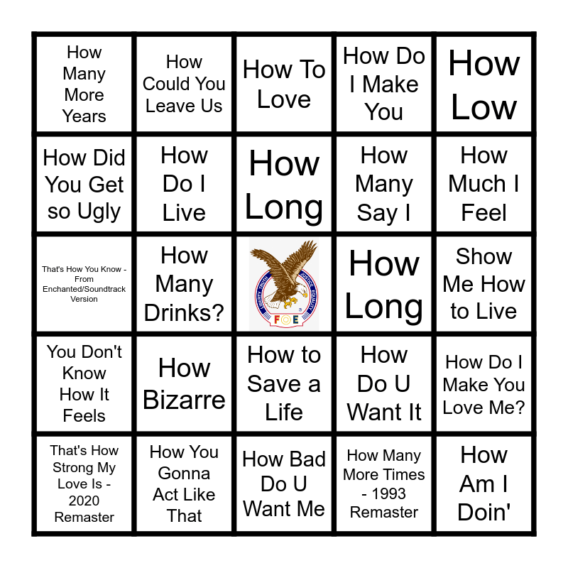 This bingo card has a free space and 50 words: (How Much Is That) Doggie In The Window, How Am I Doin', How Am I Supposed to Live without You, How Bad Do U Want Me, How Bizarre, How Could I Love Her So Much, How Could You Leave Us, How Deep Is Your Love, How Did You Get so Ugly, How Did You Love, How Do I Live, How Do I Make You, How Do I Make You Love Me?, How Do U Want It, How Do You Like Me Now?!, How Far We've Come, How Long, How Long, How Long Gone, How Low, How Many Drinks?, How Many More Times - 1993 Remaster, How Many More Years, How Many Say I, How Much A Dollar Cost, how much a heart can hold, How Much I Feel, How to Disappear Completely, How To Love, How to Save a Life, How Will I Know, How Will I Laugh Tomorrow, How Would You Feel (Paean), How Would You Like to Be, How You Gonna Act Like That, How You Gonna See Me Now, How You Remind Me, I Wish I Knew How It Would Feel to Be Free, Show Me How, Show Me How to Live, Teach Me How To Dougie, That's How Country Boys Roll, That's How I Got To Memphis, That's How I'm Feeling, That's How Strong My Love Is - 2020 Remaster, That's How You Know - From Enchanted/Soundtrack Version, This Is How We Do, This Is How We Do It, You Don't Know How It Feels and You Know How We Do It.