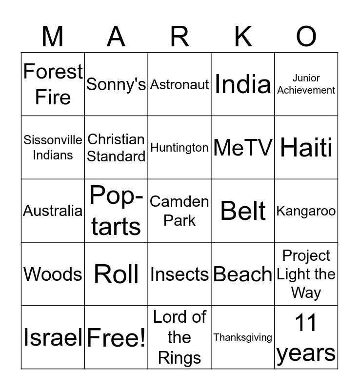 This bingo card has 30 words: Free!, Introvert, Pop-tarts, Bahamas, Forest Fire, Astronaut, Christian Standard, Insects, Belt, Lord of the Rings, Kangaroo, Camden Park, Thanksgiving, 11 years, Haiti, December 23, Beach, Woods, Roll, Junior Achievement, Australia, Beans and Franks, Sonny's, MeTV, Sissonville Indians, India, Project Light the Way, Israel, Huntington and Photography.