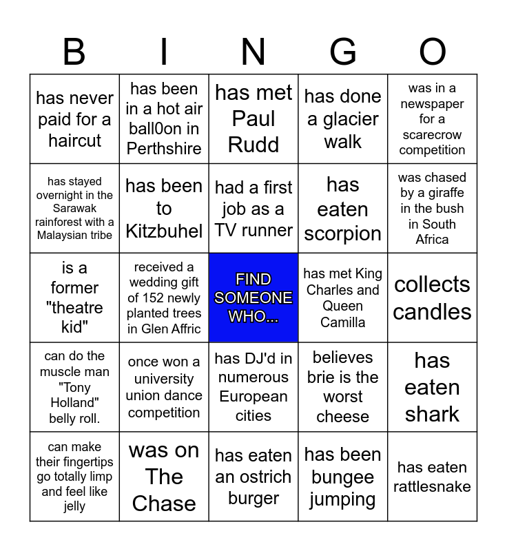 This bingo card has a free space and 34 words: has been to Iceland (the country!), has been bungee jumping, has been to the North Pole, has pet birds, can do the muscle man "Tony Holland" belly roll., has been to Kitzbuhel, was in a newspaper for a scarecrow competition, can make their fingertips go totally limp and feel like jelly, has been in a hot air ball0on in Perthshire, had a first job at a local hardware store, had a first job as a TV runner, has met Paul Rudd, believes pineapple belongs on pizza, enjoys watching Frozen on a rainy day, has met King Charles and Queen Camilla, was chased by a giraffe in the bush in South Africa, was on The Chase, is a former "theatre kid", once won a university union dance competition, believes brie is the worst cheese, has DJ'd in numerous European cities, has eaten pig brain, has never paid for a haircut, collects candles, has eaten an ostrich burger, has eaten rattlesnake, has done a glacier walk, has played on stage in a folk band, has eaten scorpion, has stayed overnight in the Sarawak rainforest with a Malaysian tribe, collects vintage musical instruments, received a wedding gift of 152 newly planted trees in Glen Affric, has eaten shark and has a dog called Mirren.