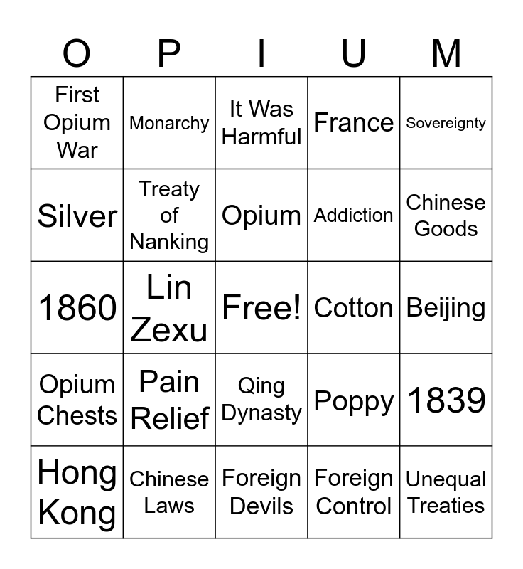 This bingo card has a free space and 39 words: Britain, Opium, Canton, Treaty of Nanking, Hong Kong, Qing Dynasty, Opium, Tea, Sovereignty, Opium Chests, Lin Zexu, France, Unequal Treaties, Beijing, Cotton, Pain Relief, Trade War, First Opium War, Second Opium War, Poppy, Silver, Foreign Devils, Addiction, Chinese Goods, Warships, It Weakened, Spheres or Influence, Ports, Extraterritoriality, Monarchy, A Peace Agreement, To Get Rich, It Was Harmful, Chinese Laws, Foreign Control, Humiliated, 1839, 1860 and Britain.