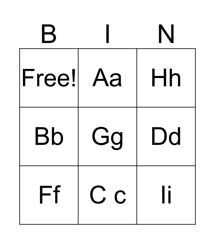 This bingo card has 9 words: Ff, Hh, Aa, Bb, Free!, Dd, Gg, Ii and C c.