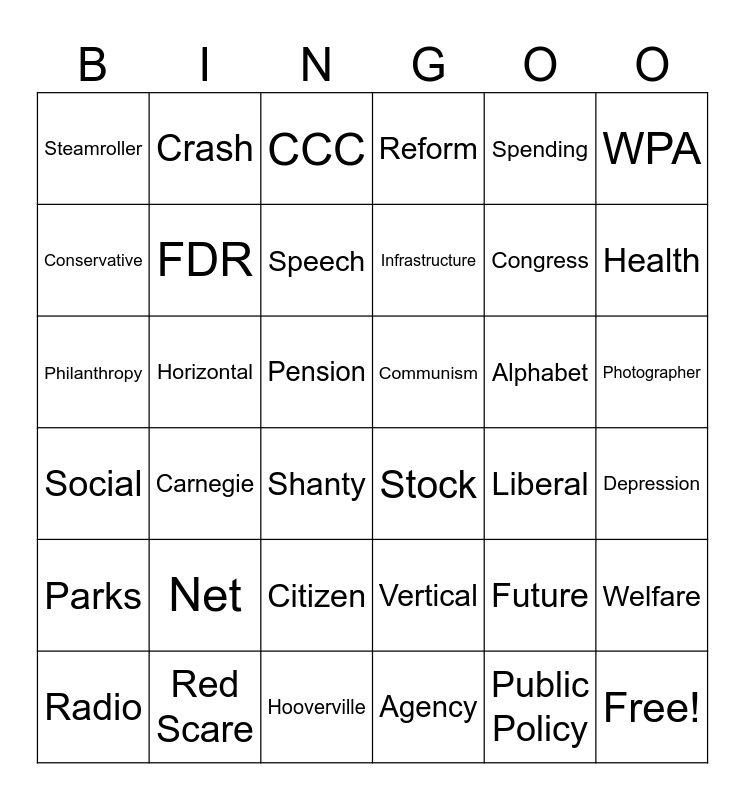 This bingo card has 42 words: Public Policy, FDR, Electricity, Alphabet, Depression, Carnegie, Philanthropy, Recovery, CCC, Photographer, Pension, Infrastructure, Health, Spending, Red Scare, Social, Welfare, Congress, Free!, Crash, WPA, Citizen, Parks, Steamroller, Cartoon, Radio, Speech, New Deal, Net, Future, Long-term, Communism, Conservative, Liberal, Hooverville, Shanty, Stock, Horizontal, Vertical, Agency, Reform and Private.