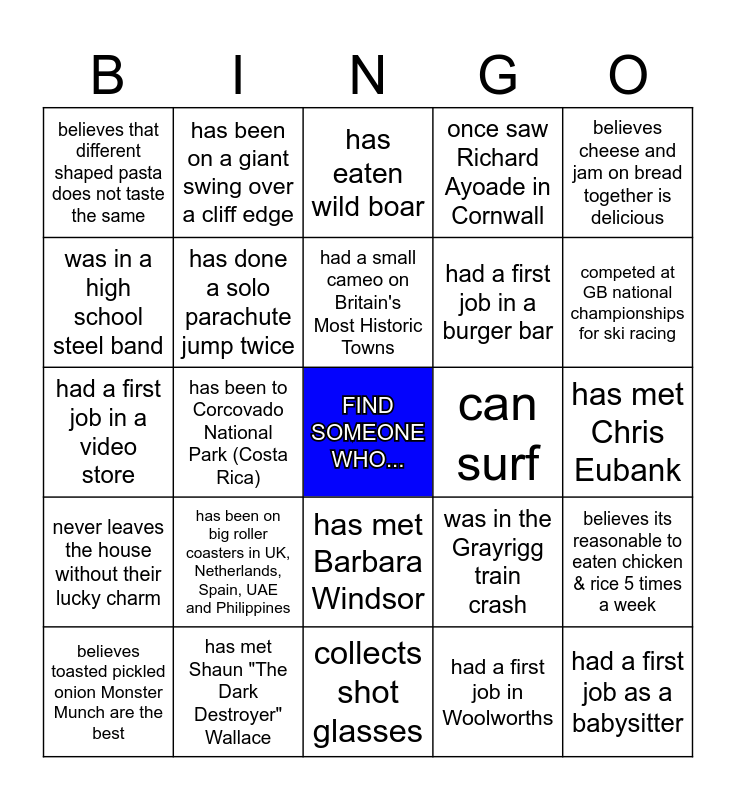 This bingo card has a free space and 34 words: had a paper round as their first job, had a first job in Woolworths, had a first job as a karaoke manager, has been to Kyrgyzstan, never leaves the house without their lucky charm, has done a solo parachute jump twice, believes cheese and jam on bread together is delicious, believes toasted pickled onion Monster Munch are the best, has been on a giant swing over a cliff edge, own's a Staffy called Molly, had a small cameo on Britain's Most Historic Towns, has eaten wild boar, once won over £20k at Bingo, has a ginger and white British Shorthair cat called Jefferson, can surf, competed at GB national championships for ski racing, has met Shaun "The Dark Destroyer" Wallace, had a first job in a video store, has been on big roller coasters in UK, Netherlands, Spain, UAE and Philippines, was in the Grayrigg train crash, has met Barbara Windsor, can make a dog with modelling balloons, believes that different shaped pasta does not taste the same, has met Chris Eubank, collects shot glasses, had a first job as a babysitter, once saw Richard Ayoade in Cornwall, has met Daniel O'Donnell (4 times!), had a first job in a burger bar, was in a high school steel band, has eaten feijoa jam, has been to Corcovado National Park (Costa Rica), believes its reasonable to eaten chicken & rice 5 times a week and walked the West Highland way in 4 days.